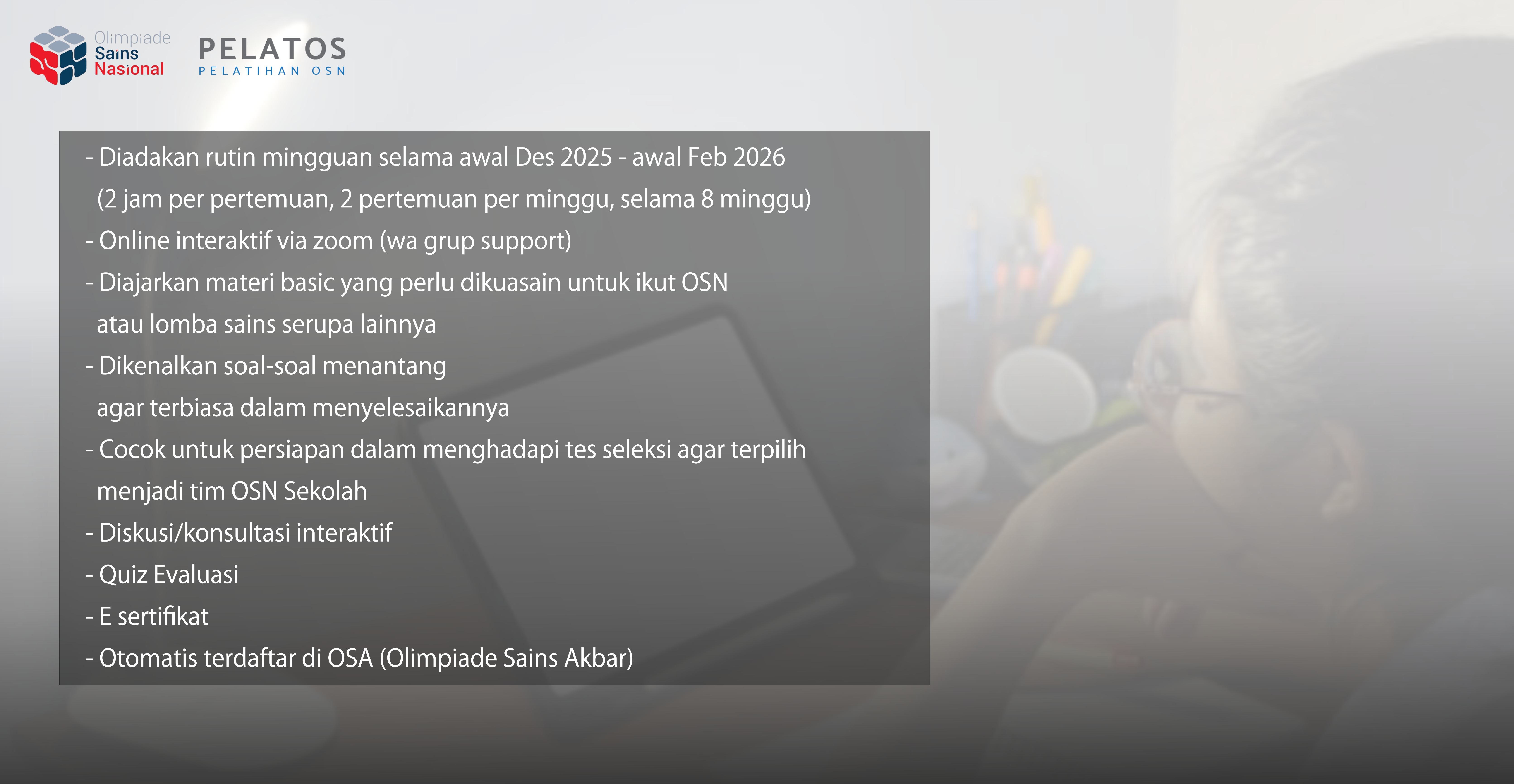 Dalam rangka persiapan awal menghadapi Olimpiade Sains Nasional tingkat Kota (OSN-K) 2026, kami membuka program Pelatihan Rutin Online Persiapan OSN-K 2026 tingkat SD, SMP dan SMA untuk pemula, berupa pembelajaran online interaktif rutin dan terjadwal yang dilakukan melalui aplikasi zoom. Peserta pelatihan ini juga akan otomatis terdaftar pada program Olimpiade Sains Akbar (OSA), yang dapat digunakan sebagai ajang uji coba kemampuan siswa sebelum OSN-K diadakan. Pelatihan ini ditujukan untuk pemula, sehingga akan diberikan materi basic yang kuat agar peserta lebih siap dalam menghadapi materi dan soal-soal yang levelnya lebih tinggi
