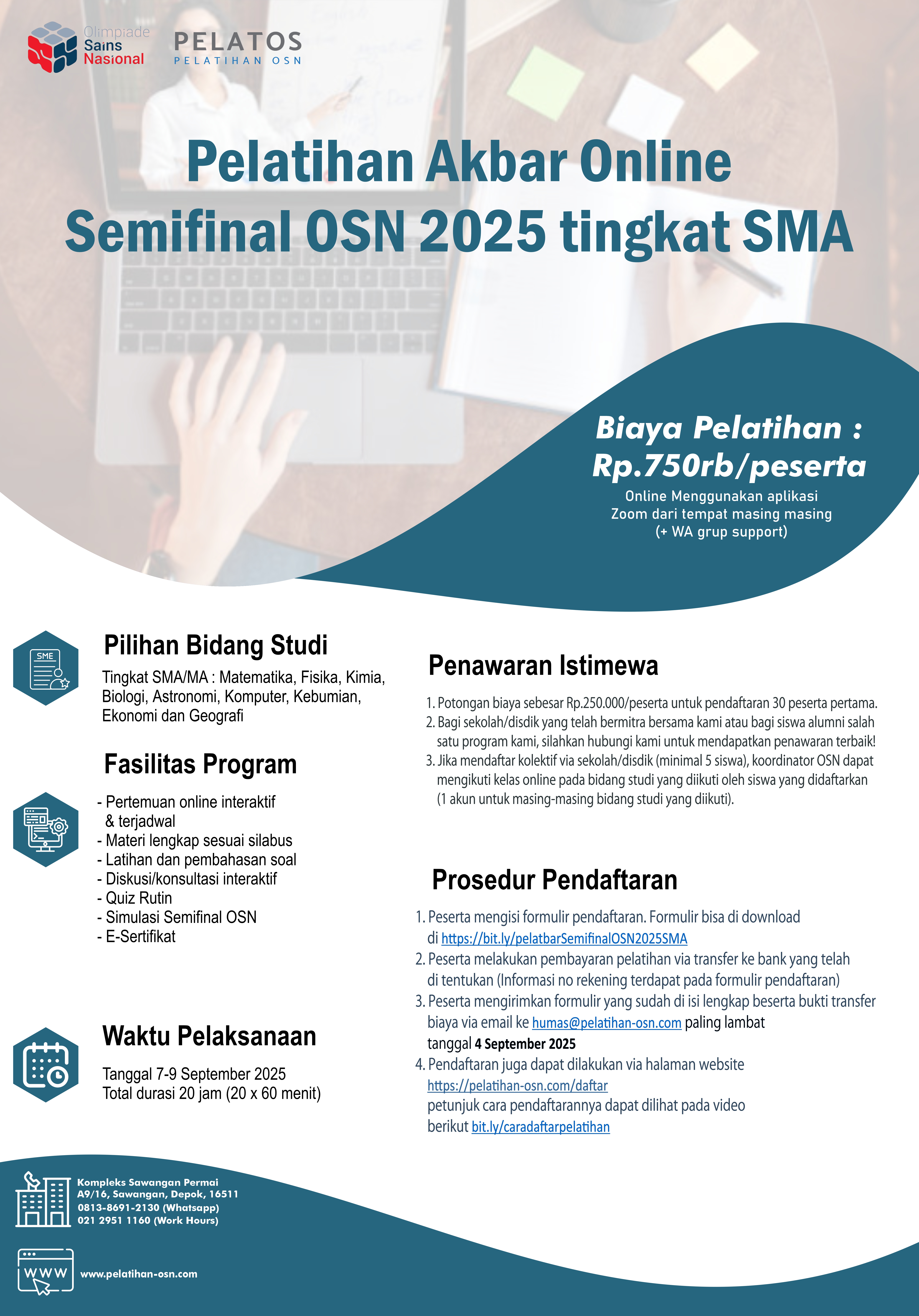 Halo Sobat Sains, Telah dibuka Pelatihan Akbar Online Semifinal OSN 2025 tingkat SMA, yang akan diadakan pada tanggal 7-9 September 2025, pelatihan ini berupa pembelajaran online interaktif intensif dan terjadwal yang dilakukan melalui aplikasi zoom. Pelatihan ini bertujuan untuk mempermantap persiapan sehingga siswa lebih siap untuk menang dan meraih medali di OSN tahun 2025.
