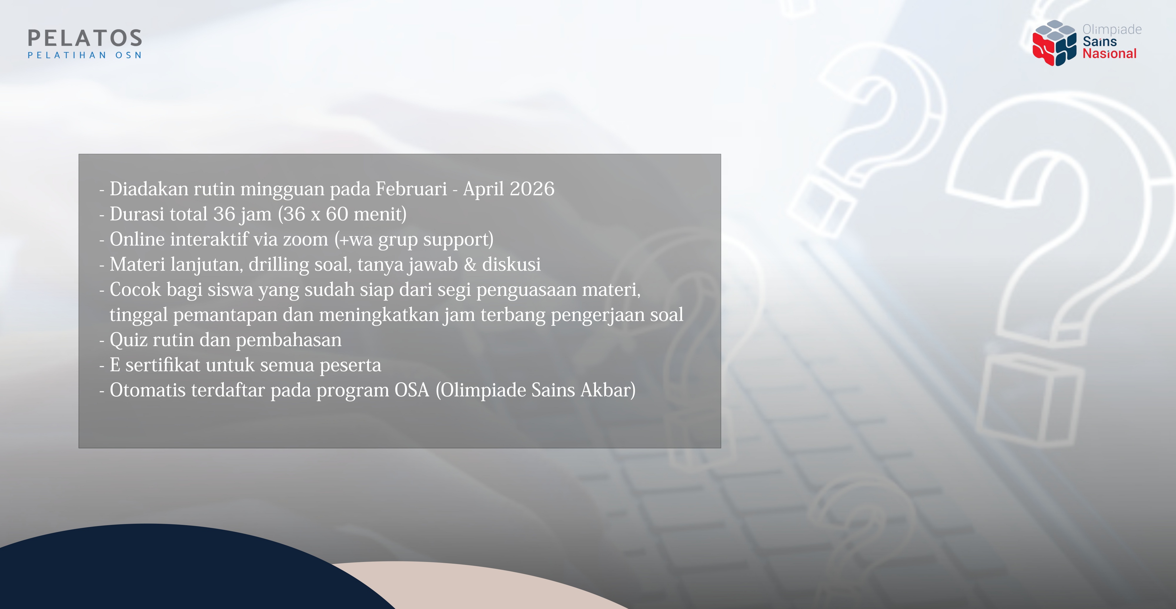 Dalam rangka persiapan menghadapi Olimpiade Sains Nasional tingkat Kota (OSN-K) 2025, kami membuka program Pelatihan Rutin Online Persiapan OSN-K 2025 tingkat SD, SMP dan SMA (level advance), berupa pembelajaran online interaktif rutin dan terjadwal yang dilakukan melalui aplikasi zoom. Peserta pelatihan ini juga akan otomatis terdaftar pada program Olimpiade Sains Akbar (OSA), yang dapat digunakan sebagai ajang uji coba kemampuan siswa sebelum OSN-K diadakan. Pada pelatihan ini akan difokuskan pada drilling soal, cocok banget bagi yang penguasaan materinya sudah bagus, tinggal pemantapan dan meningkatkan jam terbang pengerjaan soal, selain itu juga terdapat quiz evaluasi serta diskusi dan konsultasi dengan tim tentor berpengalaman.