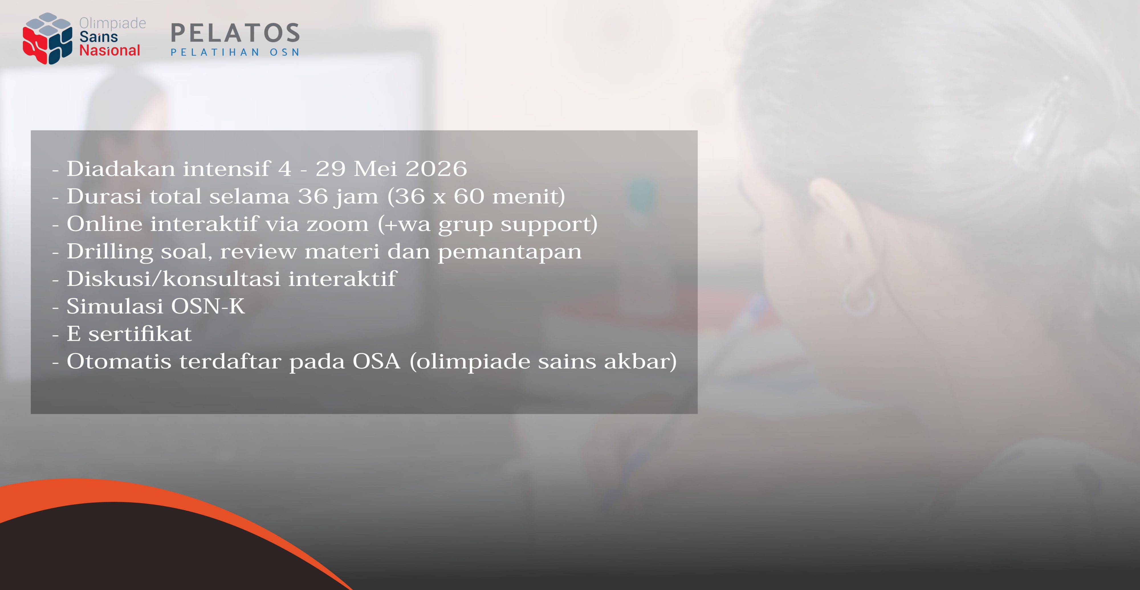 Halo Sobat Sains, Telah dibuka Pelatihan Akbar Online OSN-K 2026 tingkat SD & SMP (kelas sore), yang akan diadakan pada tanggal 4 - 29 Mei 2026, pelatihan ini berupa pembelajaran online interaktif intensif dan terjadwal yang dilakukan melalui aplikasi Zoom. Pelatihan ini bertujuan untuk mempermantap persiapan sehingga siswa lebih siap untuk menang di OSN-K dan lolos ke OSN-P dan OSN tahun 2026.